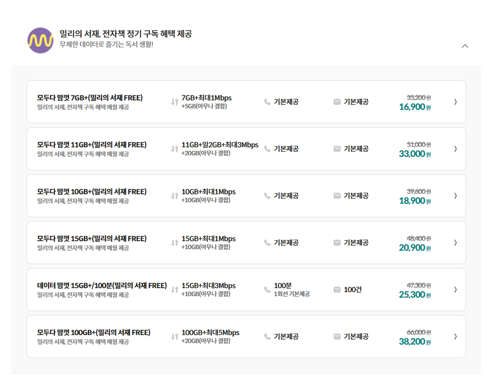 기본적인 데이터와 더불어 전화통화량과 메세지가 기본제공되며 밀리의 서재 전자책 구독 혜택을 매월 제공 받을 수 있습니다.