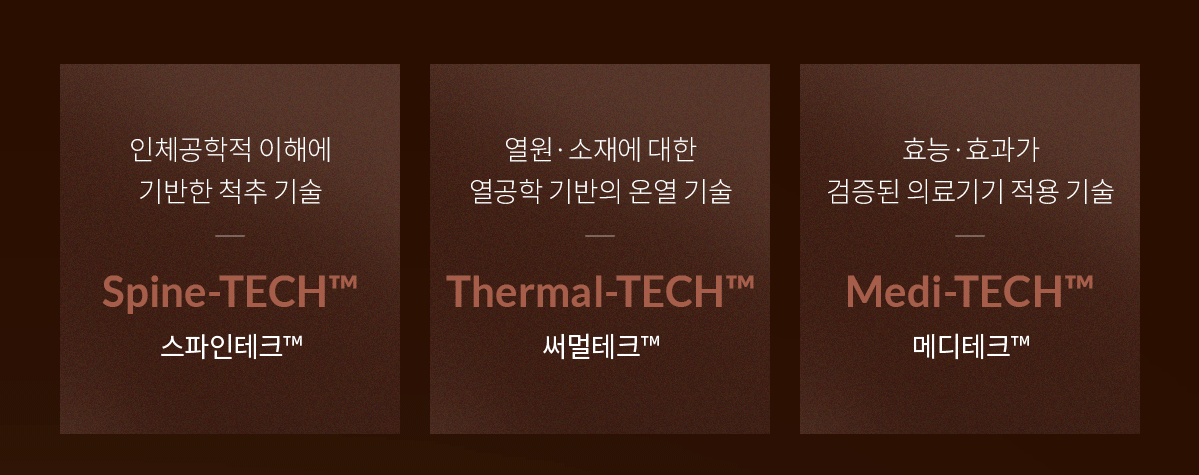◾ 열원 · 소재에 대한 열공한 기반의 온열 기술 써멀테크는 척추가 편안한 180˚ 자세에서 척추 전체 라인을 따라 수직 · 수평 밀착 압박 마사지를 제공합니다.