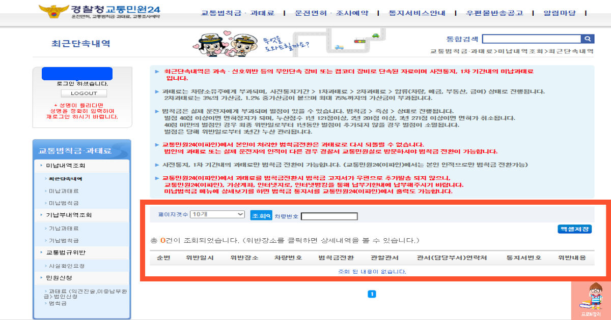 2.🔑상단에 교통범칙금 · 과태료 클릭 > 미납내역조회 > 최근단속내역 클릭하세요.