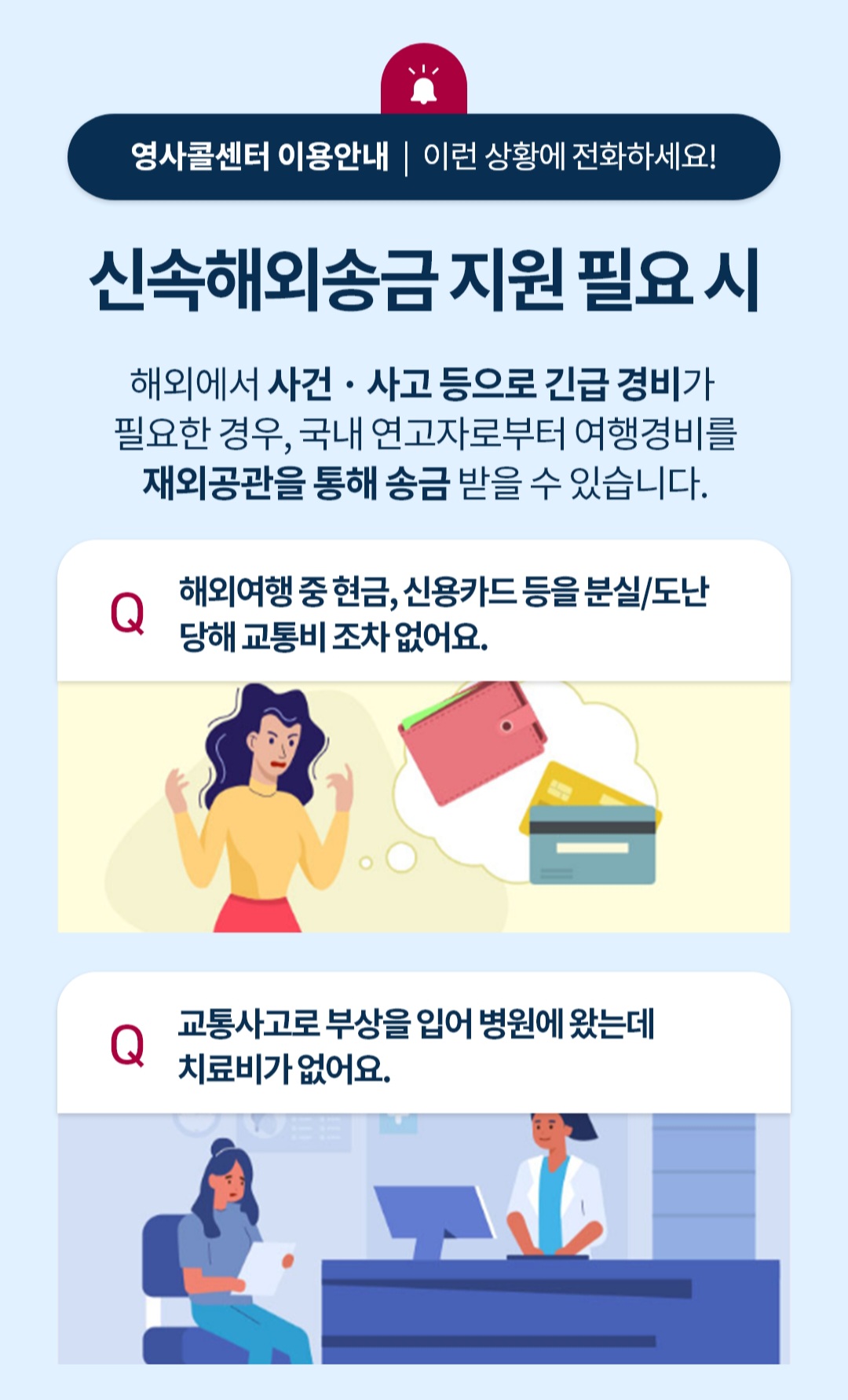 해외 긴급 상황 시 통역 서비스 (영어, 중국어, 일본어, 베트남어, 프랑스어, 러시아어, 스페인어 지원)